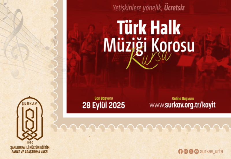 Yetişkinlere yönelik, ücretsiz olarak verilecek olan Türk Halk Müziği, Türk Sanat Müziği, Klasik Türk Tasavvuf Musikisi, Halk Oyunları ve Tezhip kurslarına müracaatlar 8 - 28 Eylül 2025 tarihleri arasında https://www.surkav.org.tr/kayit adresinden çevrim içi yapılabileceği gibi, Yusufpaşa Mah. 886. Sk. No:27 adresinde bulunan ŞURKAV İdare Merkezi’nden de gerçekleştirilebilecektir.