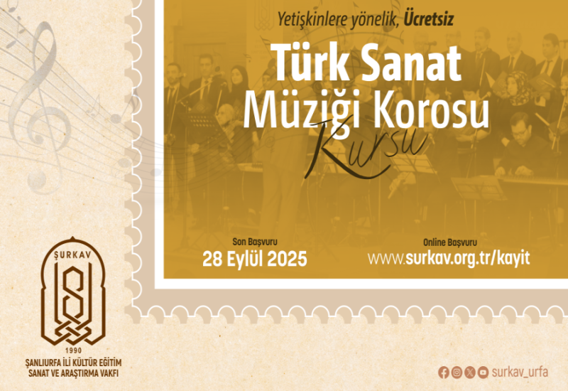 Yetişkinlere yönelik, ücretsiz olarak verilecek olan Türk Halk Müziği, Türk Sanat Müziği, Klasik Türk Tasavvuf Musikisi, Halk Oyunları ve Tezhip kurslarına müracaatlar 8 - 28 Eylül 2025 tarihleri arasında https://www.surkav.org.tr/kayit adresinden çevrim içi yapılabileceği gibi, Yusufpaşa Mah. 886. Sk. No:27 adresinde bulunan ŞURKAV İdare Merkezi’nden de gerçekleştirilebilecektir.