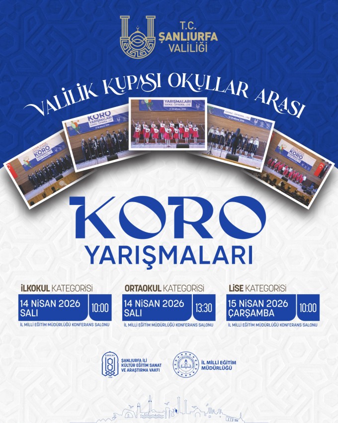 Şanlıurfa’da öğrencilerin sanatsal gelişimine katkı sağlamak ve müziğin birleştirici gücünü geniş kitlelerle buluşturmak amacıyla düzenlenen Valilik Kupası Okullar Arası Koro Yarışmaları, 14-15 Nisan 2026 tarihlerinde gerçekleştirilecektir.