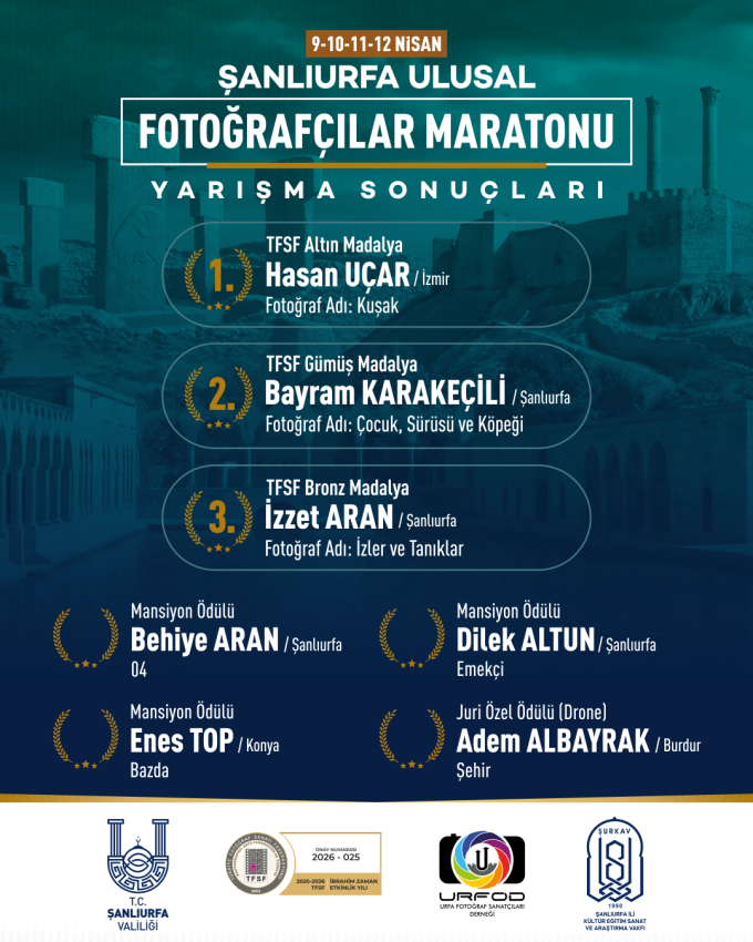 Şanlıurfa’nın köklü tarihini, zengin kültürel dokusunu ve eşsiz yaşamını objektiflere yansıtmayı amaçlayan Şanlıurfa Fotoğrafçılar Maratonu tamamlandı. “Tarih, Turizm, Kültür, Sanat, Yaşam ve Mimari” temasıyla 9–12 Nisan 2026 tarihleri arasında gerçekleştirilen yarışmanın sonuçları kamuoyuyla paylaşıldı.